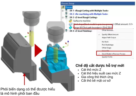 Tính toán mô hình phôi trong CAM hiện đã được hỗ trợ cho nhiều chiến lược gia công thô hơn. Hệ thống tự động nhận diện vùng vật liệu còn lại dựa trên sự khác biệt giữa hình dạng sản phẩm và phôi trước đó, từ đó tạo ra đường chạy dao hiệu quả. Việc thiết lập phôi ban đầu có hình dạng bất quy tắc giúp rút ngắn thêm thời gian gia công bằng cách giảm thiểu cắt không tải (air cuts) và tối ưu hóa đường chạy dao.