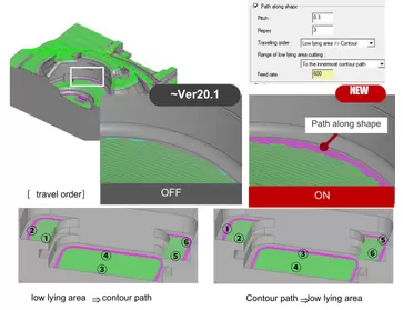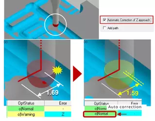 Đã thêm tính năng phát hiện và sửa lỗi tự động liên quan đến tiếp cận trục Z trong tính toán đường chạy dao và can thiệp của trục Z trong các chuyển động kết nối. Điều này giúp giảm đáng kể thời gian thử và sai khi tránh các lỗi cảnh báo kết thúc chương trình.
