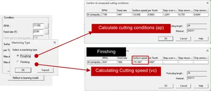 Tính năng này tính toán điều kiện cắt tham chiếu dựa trên chiều dài nhô ra của dao, cho phép AI xác định các thông số gia công phù hợp với tỷ lệ L/D từ 5 trở lên. Chức năng này chỉ áp dụng cho dao cầu MOLDINO. |