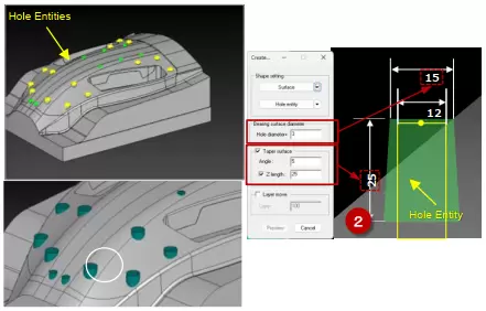 Hệ thống tự động tạo hình học bề mặt chịu lực cho các thao tác khoan 3D dựa trên dữ liệu hình học lỗ. Người dùng có thể tham số hóa việc tạo bề mặt chịu lực bằng cách chỉ định đường kính lỗ, góc côn và chiều dài theo trục. Ngoài ra, chức năng gán lớp và xem trước theo thời gian thực cũng được hỗ trợ, giúp đơn giản hóa quá trình xây dựng bề mặt chịu lực. Tự động hóa này loại bỏ thao tác dựng hình CAD thủ công, từ đó tiết kiệm đáng kể thời gian lập trình.