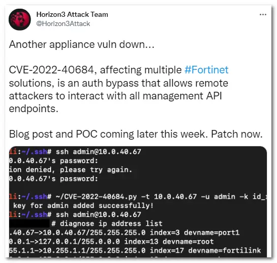 Several days later, Fortinet finally acknowledged that they were aware of at least one attack in which CVE‑2022‑40684 had been exploited. The company stated: “Fortinet is aware of an instance where this vulnerability was exploited and recommends immediately validating your systems for intrusion indicators in the device logs: user = ‘Local_Process_Access’.”