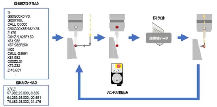 On-machine measurement: Using the machining tool handle, coordinate values can be output to a text file via macro output, reducing measurement time.