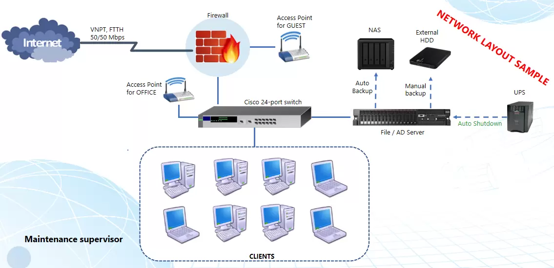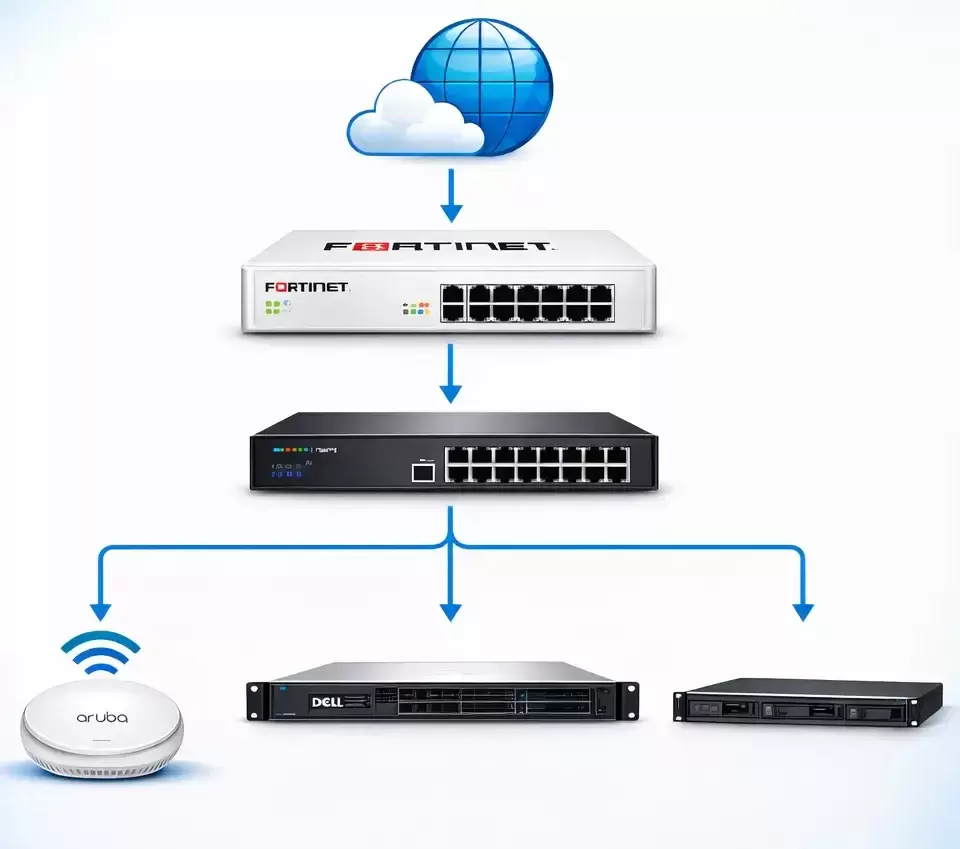 Firewall, core switches, and enterprise WiFi ensure continuous connectivity. - Centralized data storage