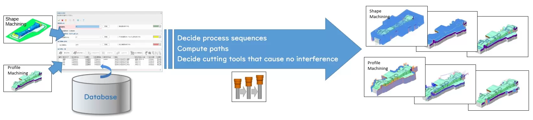 - Dựa trên các thông tin như kích thước của holder, chuck và dụng cụ cắt, có thể kiểm tra các khu vực có thể xảy ra va chạm và không thể gia công dựa trên dữ liệu thiết kế 3D.