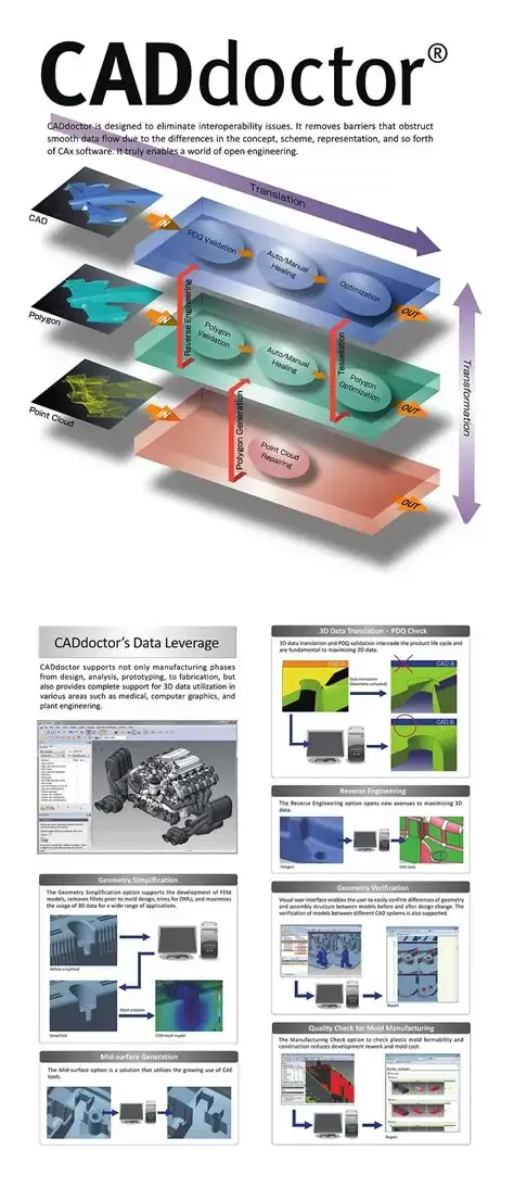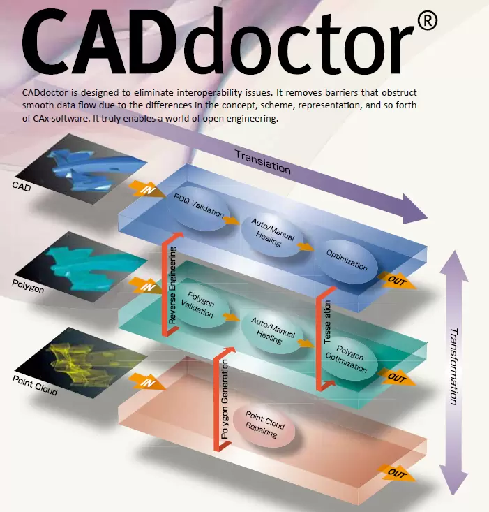 Được phát triển bởi Elysium – Nhật Bản, CADdoctor được tin dùng bởi các tập đoàn lớn trong lĩnh vực ô tô, hàng không, cơ khí và chế tạo khuôn mẫu, nơi việc trao đổi dữ liệu giữa các phần mềm CAD khác nhau diễn ra thường xuyên.