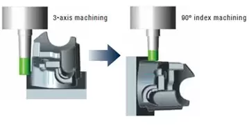 - Gia công đồng thời 5 trục có thể tạo ra bề mặt có chất lượng cao nhất bằng cách điều khiển các trục quay một cách mượt mà với thay đổi biên độ trục nghiêng nhỏ nhất. Trong Simultaneous 5-Axis Machining, các đường đi dao 3 trục được chuyển đổi thành các đường đi dao đồng thời 5 trục bằng "chức năng chuyển đổi 5 trục". Đây là một cơ chế gán dữ liệu vector dao cụ mà không thay đổi vị trí dao cắt. Phương pháp này không đòi hỏi kỹ năng cụ thể hoặc hiểu biết quá nhiều về gia công đồng thời 5 trục, điều mà các nhà sản xuất thường trăn trở.