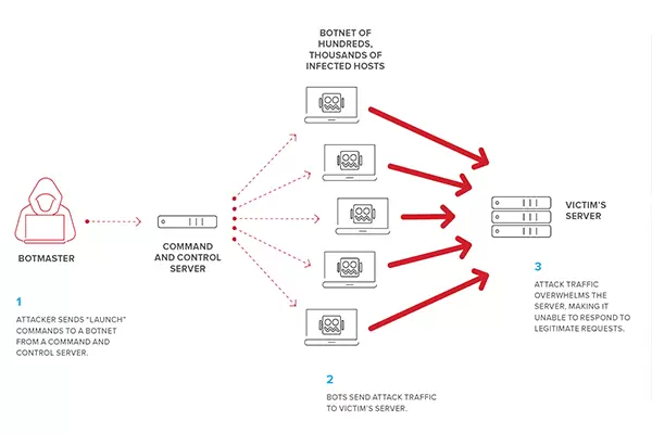 Các cuộc tấn công DDoS đạt được hiệu quả bằng cách sử dụng nhiều hệ thống máy tính bị xâm nhập làm nguồn lưu lượng tấn công. Máy được khai thác có thể bao gồm máy tính và các tài nguyên nối mạng khác như thiết bị IoT. Nói theo cách đơn giản, bạn hãy xem một cuộc tấn công DDoS giống như một vụ tắc đường bất ngờ làm tắc nghẽn giao thông trong một khoảng thời gian dài.