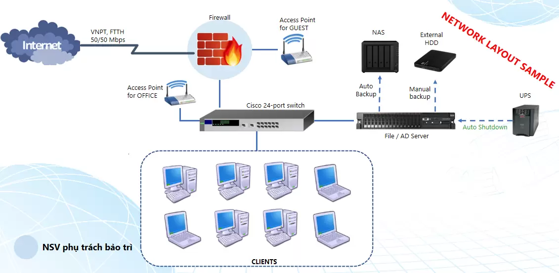 Sử dụng firewall, switch core và WiFi doanh nghiệp để đảm bảo kết nối liên tục. - Lưu trữ dữ liệu tập trung